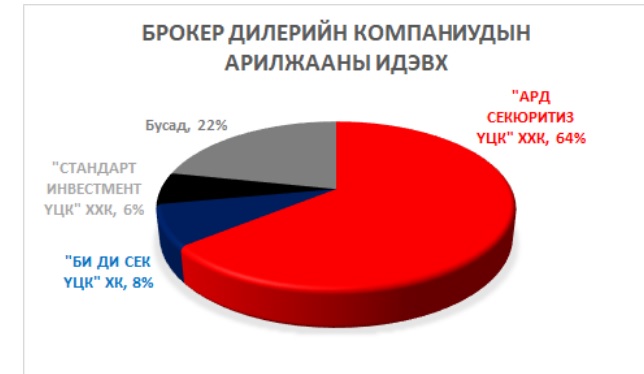 Хамгийн их буюу 160.4 тэрбум төгрөгийн арилжааг Ард Секюритиз ҮЦК дангаараа зуучилсан байна. Энэ нь нийт арилжааны 64 хувь нь гэсэн үг. Үүний дараагаар хоёрдугаарт орж буй компани нь нийт арилжааны найман хувийг л зуучилсан аж.