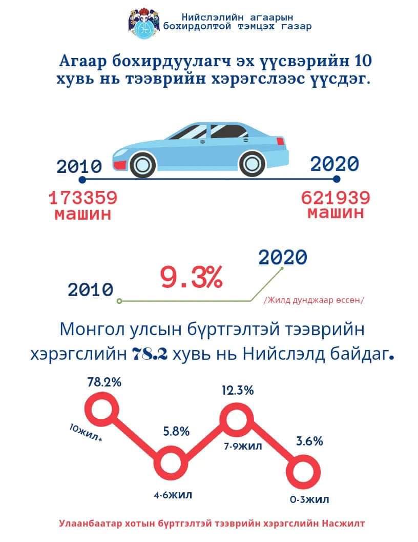Харин 2020 онд 621.939 болж нэмэгдсэн нь өмнөх онтой харьцуулахад 5.9 хувиар өссөн үзүүлэлт юм. Улаанбаатар хотод бүртгэлтэй тээврийн хэрэгслийн насжилтыг сүүлийн найман жилийн дунджаар харвал, 78.2 хувь нь 10 болон түүнээс дээш жилийн, 12.3 хувь нь 7-9 жил, 5.8 хувь нь 4-6 жил, 3.6 хувь нь 0-3 жилийн насжилттай байна.