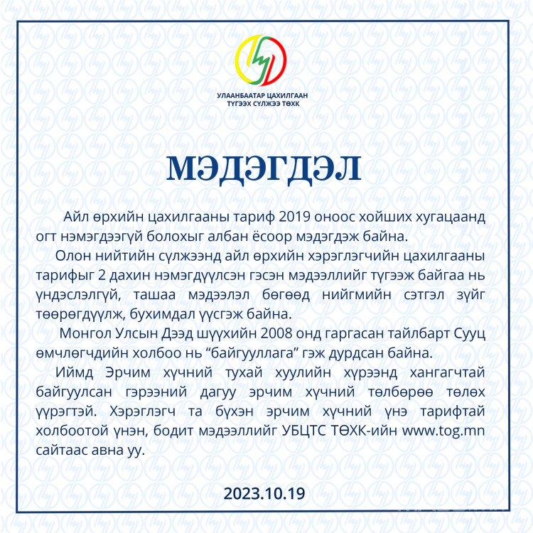 Олон нийтийн сүлжээгээр айл өрхийн цахилгааны тарифыг хоёр дахин нэмэгдүүлсэн гэх мэдээлэл цацагдсан. Тэгвэл уг асуудлаар Улаанбаатар цахилгаан түгээх сүлжээ ТӨХК-иас дараах мэдэгдлийг гаргажээ.