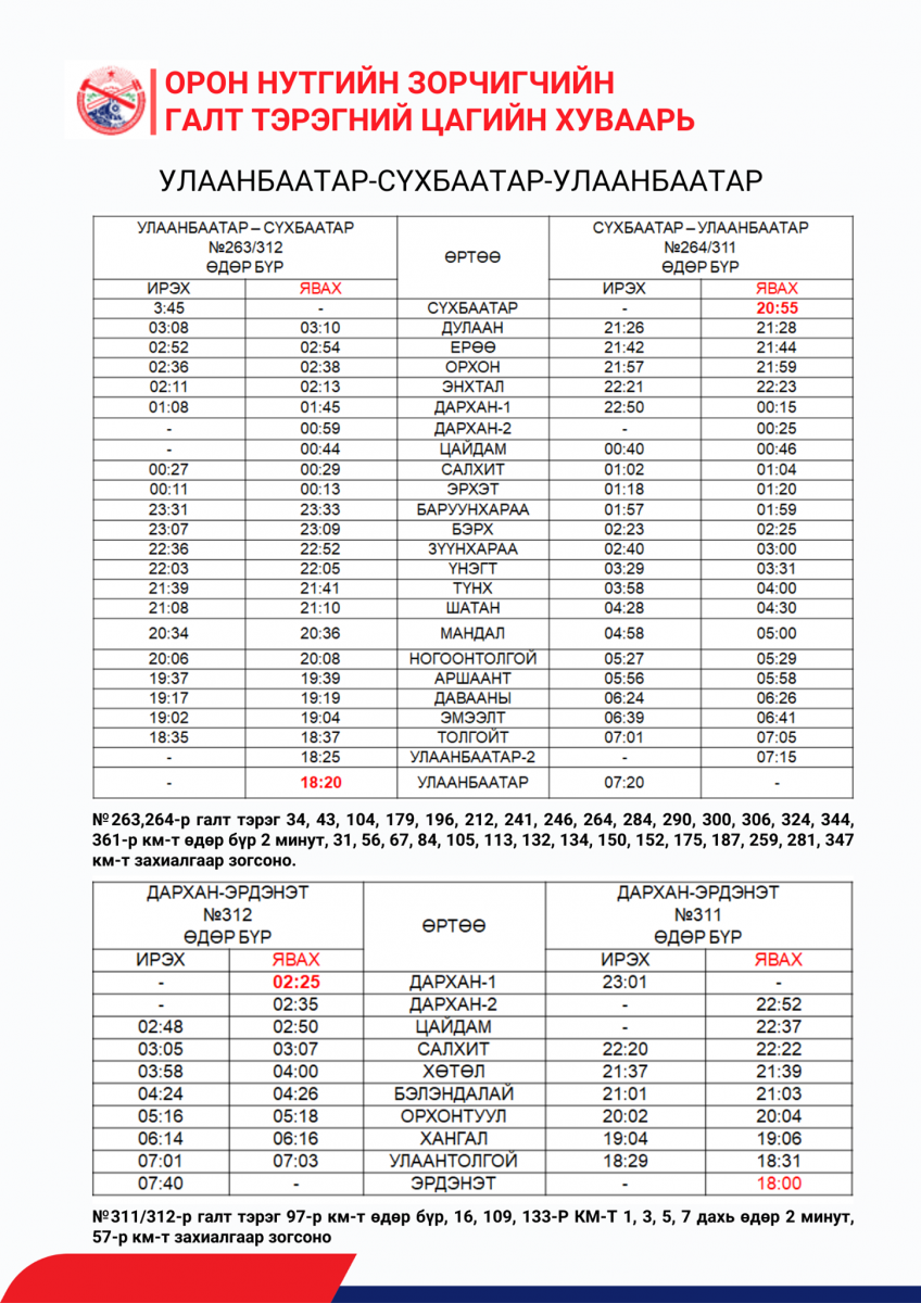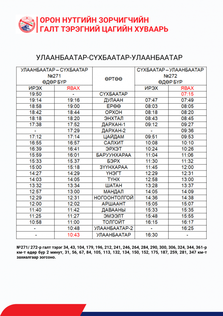 Харин одоогоор Сайншанд, Замын-Үүдийн чиглэлд аялж эхлээгүй байна. Зорчигчийн галт тэргээр аялахдаа УОК-ын даргын 2021 оны 5 дугаар сарын 19-ны өдрийн 46 тоот тушаалаар баталсан “Хот болон орон нутаг хооронд иргэдийн зорчих хөдөлгөөнийг зохицуулах түр журам”-д заасны дагуу дараах бичиг баримтыг заавал бүрдүүлж, халдвар хамгааллын дэглэмийг чанд мөрдөн зорчихыг анхааруулж байна. Үүнд:
