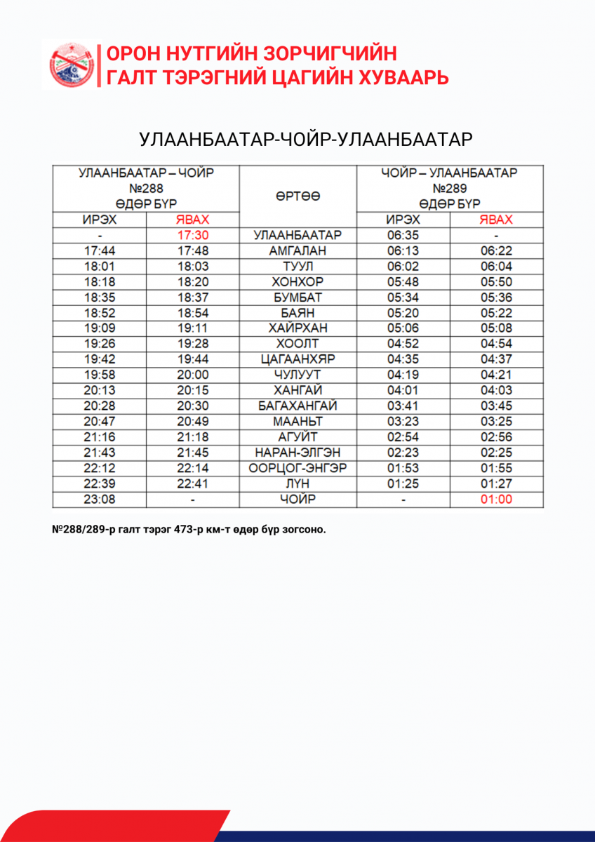 Харин 0-17 насны хүүхдээс коронавируст халдварын бх-ПГУ болон антигенд суурилсан түргэвчилсэн шинжилгээний сөрөг хариу ШААРДАХГҮЙ бөгөөд шалган нэвтрүүлэх хяналтын цэгүүдэд асуумж авч, биеийн халууныг үзэж, коронавируст халдварын эмнэлзүйн шинж тэмдэг илэрсэн тохиолдолд хүүхдээс түргэвчилсэн шинжилгээ авч холбогдох хариу арга хэмжээг тухайн орон нутгийн онцгой комисс хариуцан зохион байгуулна. Эдгээр бичиг баримтыг бүрдүүлсэн зорчигч дараах цагийн хуваарийн дагуу орон нутгийн зорчигчийн галт тэргээр зорчиж болох юм.