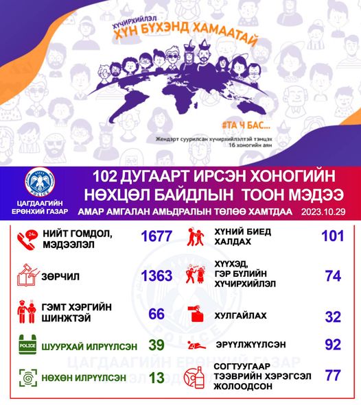 Цагдаагийн байгууллагын 102 тусгай дугаарт 2023 оны 10 дугаар сарын 29-ний өдөр нийт 1677 дуудлага, мэдээлэл бүртгэгдсэнээс зөрчлийн шинжтэй 1363, гэмт хэргийн шинжтэй 66 дуудлага, мэдээлэл байна.