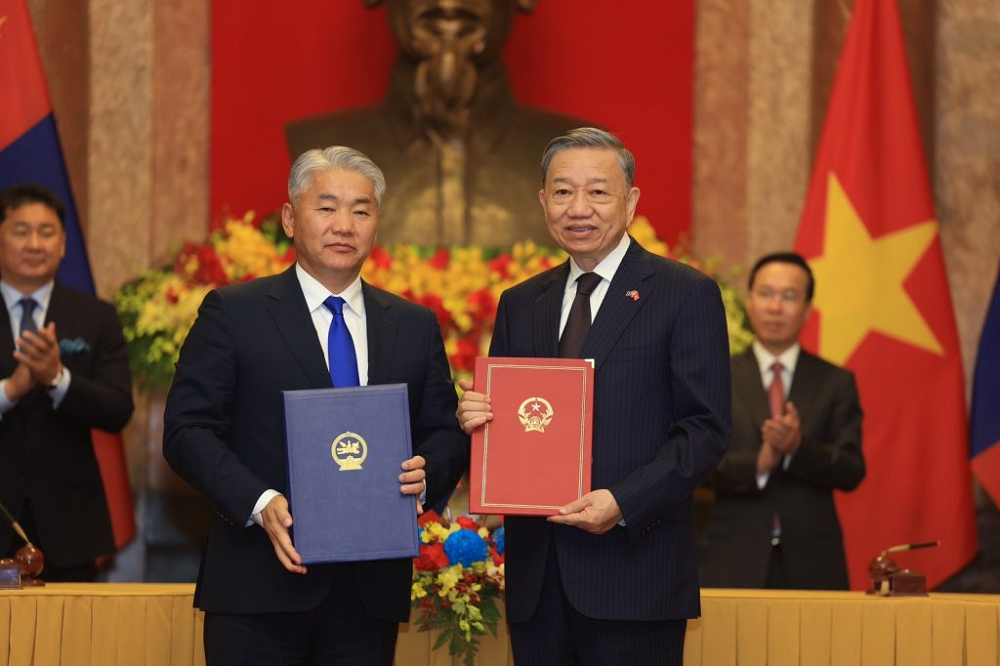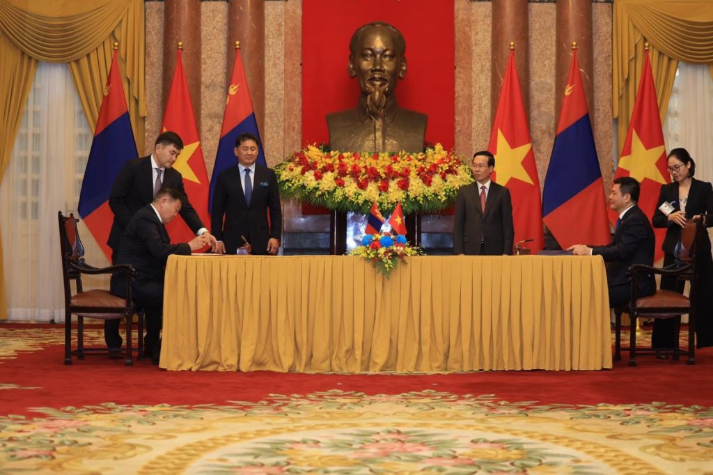 Монгол Улсын Ерөнхийлөгчийн Бүгд Найрамдах Социалист Вьетнам Улсад хийж буй төрийн айлчлалын хүрээнд Монгол Улсын Ерөнхийлөгч Ухнаагийн Хүрэлсүх, БНСВУ-ын Ерөнхийлөгч Во Ван Тыөнг нарыг байлцуулан хоёр улсын харилцаа, хамтын ажиллагааны баримт бичигт гарын үсэг зурах ёслол боллоо.