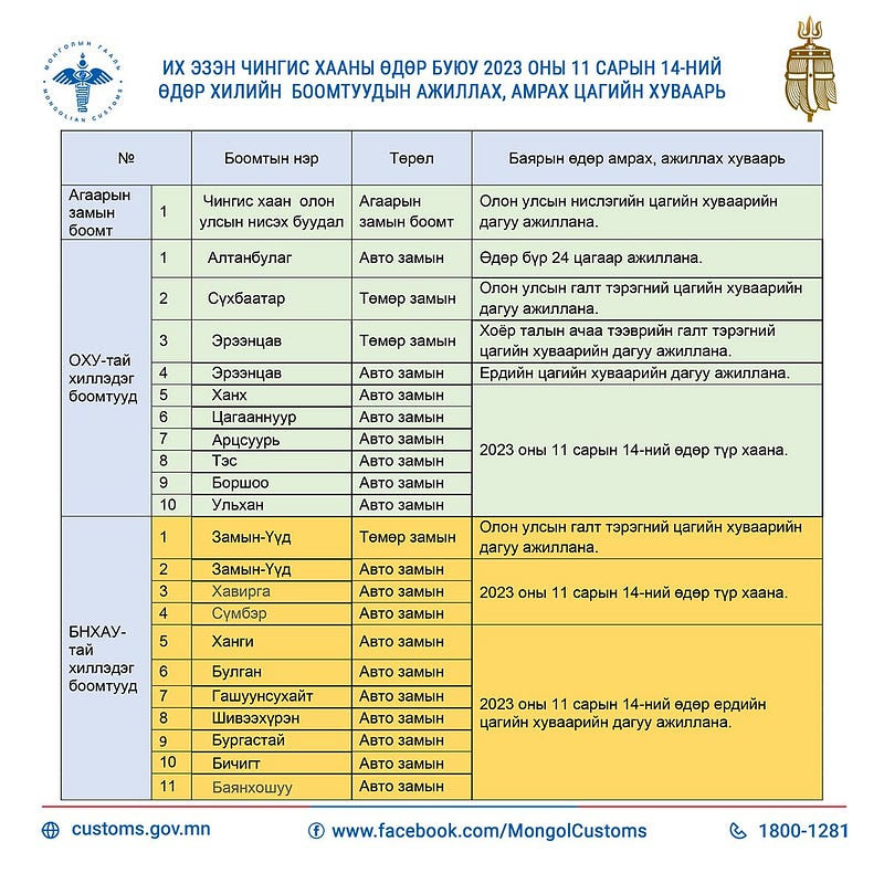 Маргааш буюу арваннэгдүгээр сарын 14-ний өдөр Их эзэн Чингис хааны мэндэлсний ой, Монгол бахархлын өдөр маргааш тохиож буй. Тус өдрийг бүх нийтийн амралт болгон хуульчилсан бөгөөд хилийн боомтууд дараах цагийн хуваарийн дагуу ажиллана.