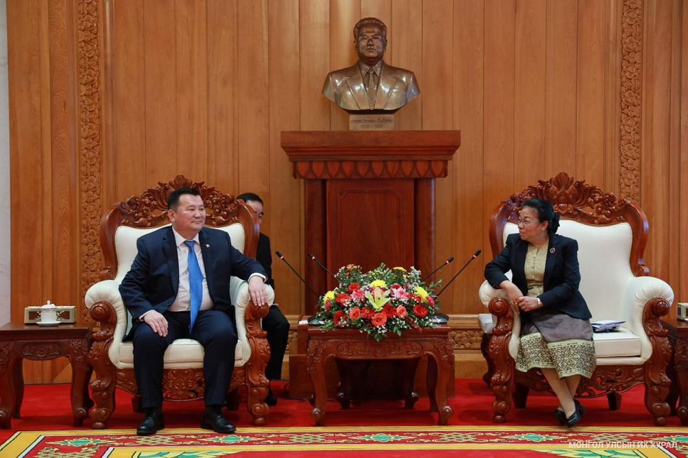 Үндэсний Ассамблейн дарга Сайсумпон Фомвихантай хийсэн уулзалтын явцад найрсаг дотно харилцаатай Монгол, Лаос хоёр улсын хооронд дипломат харилцаа тогтоосны түүхт 60 жилийн ой өнгөрсөн онд тохиож, талууд ёслол төгөлдөр тэмдэглэн өнгөрүүлсэнд баяртай байгаагаа илэрхийлж, хоёр улсын хууль тогтоох байгууллага хоорондын харилцаа, хамтын ажиллагаа өнгөрсөн хугацаанд идэвхтэй хөгжиж ирснийг онцоллоо.