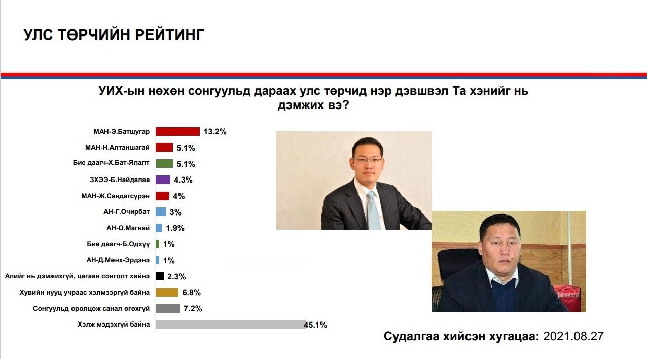 УИХ-ын сонгуулийн 28 дугаар тойрог буюу Сонгинохайрхан дүүрэгт нэр дэвших магадлалтай улс төрчдийн дунд хийсэн судалгаагаар Э.Батшугар өндөр дүн үзүүлжээ.