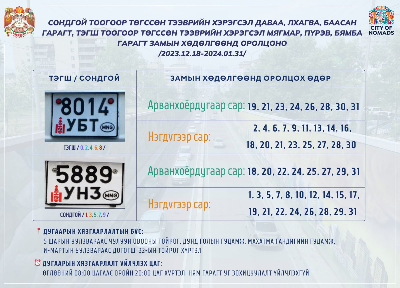 Замын хөдөлгөөний түгжрэл, ачааллыг бууруулах зорилгоор 2023 оны арванхоёрдугаар сарын 18-наас 2024 оны нэгдүгээр сарын 31-нийг дуустал автомашиныг улсын дугаарын тэгш, сондгойгоор замын хөдөлгөөнд оролцуулахаар шийдвэрлэсэн. Тодруулбал, улсын дугаарын сүүлчийн орон нь сондгой тоо (1,3,5,7,9)-гоор төгссөн тээврийн хэрэгсэл Даваа, Лхагва, Баасан гарагт, тэгш тоо (0,2,4,6,8)-гоор төгссөн тээврийн хэрэгсэл Мягмар, Пүрэв, Бямба гарагт тус тус 08:00-20:00 цагийн хооронд замын хөдөлгөөнд оролцох юм. Тухайн зохицуулалт Ням гарагт үйлчлэхгүй.