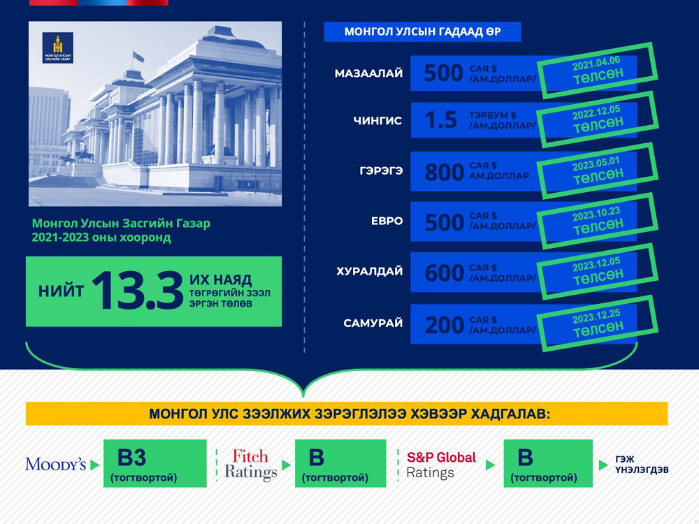 Засгийн газар “Чингис” бондын 1.5 тэрбум ам.доллар, “Мазаалай” бондын 500 сая ам.доллар, “Гэрэгэ” бондын 800 сая ам.доллар, “Хурилдай” бондын 430 сая ам.доллар, “Евро” бондын 500 сая ам.доллар, “Самурай” бондын 200 сая ам.долларын өр болон бусад өр төлбөрийг төлөхөд өнгөрсөн хугацаанд 13.3 их наяд төгрөг зарцуулсан байна.