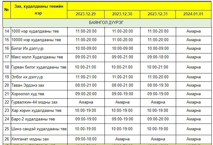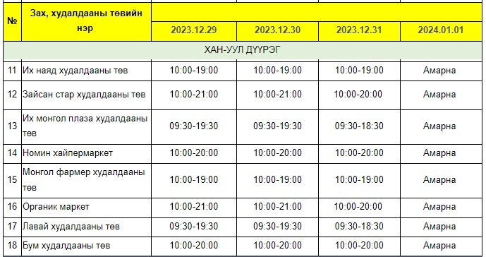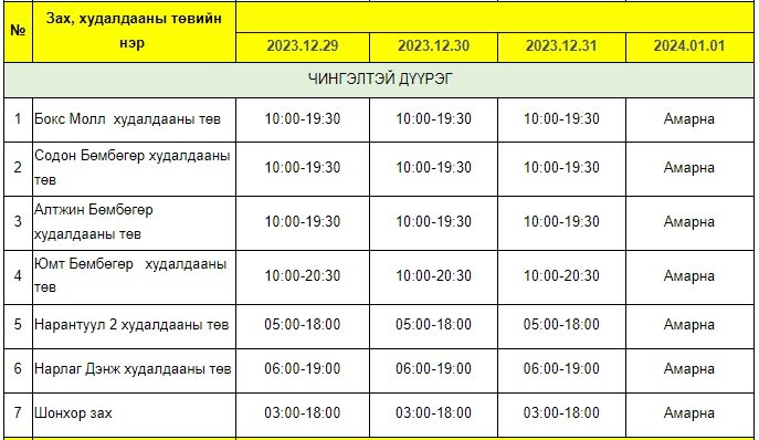 Энэ хугацаанд зах, худалдааны төв, хүнсний сүлжээ болон барааны дэлгүүрүүдийн ажиллах хуваарийг гаргажээ.