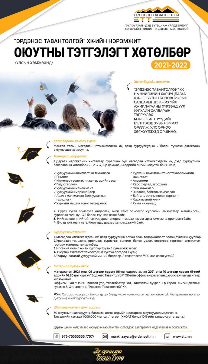 Хамрагдахыг хүссэн оюутнууд магадлан итгэмжлэгдсэн их, дээд сургуулийн албан ёсны тодорхойлолт болон дүнгийн хуулбар, уралдаан тэмцээнд оролцож, сурлагын амжилт болон урлаг, спортоор гаргасан амжилтыг гэрчлэх материалын хуулбар, иргэний үнэмлэхийн хуулбар нэг хувь, нэг хувь цээж зураг, оюутны тэтгэлэгт хамрагдахыг хүссэн өргөдөл, Хариуцлагатай уул уурхай миний бодлоор...” сэдэвт эссе /500-аас дээш үгтэй/ зэргийг бүрдүүлнэ. Материалыг ирэх сарын 6-ны өдрөөс эхлэн аравдугаар сарын 1-ний өдрийн 16.30 цаг хүртэл “Эрдэнэс Тавантолгой” ХК-ийн оффисын ресепшн дээр эсвэл шуудангаар хүлээн авах юм байна.