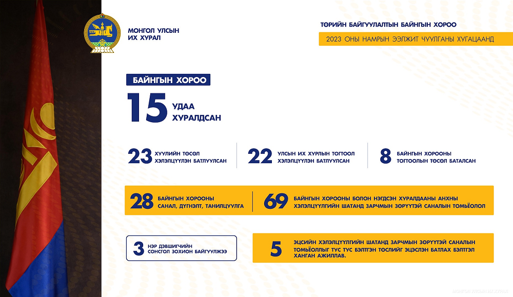 Тэрбээр, Нийслэл Улаанбаатар хотын замын хөдөлгөөний түгжрэлийг бууруулах, гэр хорооллыг орон сууцжуулах тухай болон дагалдан гарсан бусад хуулиуд, сонгуулийн тогтолцоонд өөрчлөлт оруулж, Улс төрийн намын тухай хуульд нэмэлт, өөрчлөлт оруулсантай холбогдуулан Сонгуулийн ерөнхий хорооны Тамгын газрын орон тооны дээд хязгаарыг тогтоох тухай УИХ-ын тогтоолыг хэлэлцүүлэн батлуулсан. Мөн УИХ-ын Ерөнхий нарийн бичгийн даргыг томилох, чөлөөлөх асуудлыг хэлэлцэж шийдвэрлэлээ.