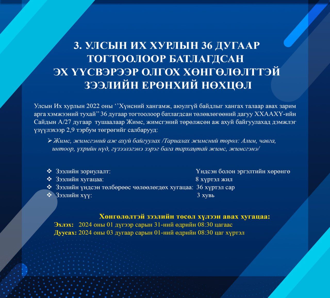 Жижиг, Дунд Үйлдвэрийг Хөгжүүлэх Сангаас 2024 онд хөнгөлөлттэй зээл хүлээн авах, сонгон шалгаруулах, санхүүжүүлэх чиглэлээр Хүнс, Хөдөө Аж Ахуй, Хөнгөн Үйлдвэрийн сайдын тушаалаар гурван ерөнхий нөхцөлийн хүрээнд нийт 36 тэрбум төгрөгийн санхүүжилт олгохоор батлагджээ.