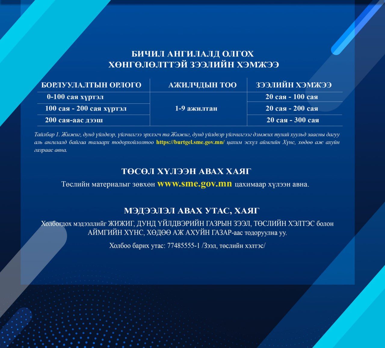 Зээлийн хүсэлт, төслийн материалыг зөвхөн цахимаар хүлээн авна. www.sme.gov.mn цахим хуудаст бүртгүүлэн нэвтэрч хүсэлтээ илгээнэ үү.