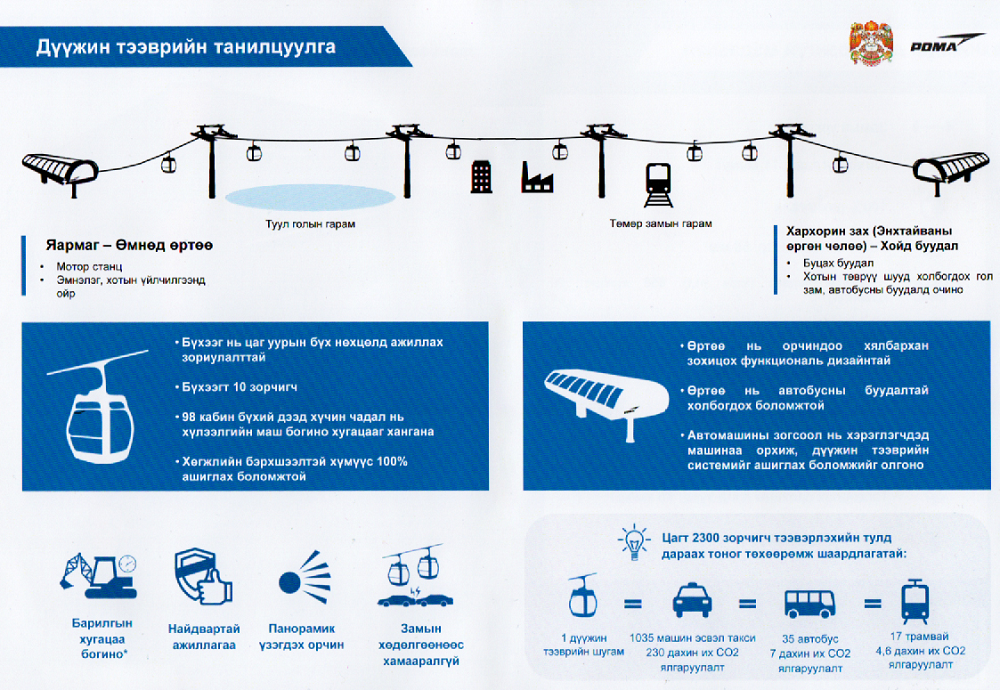 -“Пома” групп нь дэлхийн олон улсад дүүжин тээвэр хийсэн туршлагатай. Дүүжин тээврийн кабин, сандал хүйтний улиралд халдаг учраас иргэд даарахгүй, тухтай зорчино. Харин дулааны улиралд агаар чөлөөтэй нэвтрүүлэх салхивчтай. Хоёр тусдаа эх үүсвэрээс эрчим хүч авах тул тог тасрах асуудал гарахгүй. Аврах төхөөрөмжөөр тоноглосон учраас аюулгүй зорчих боломжтой хэмээлээ.