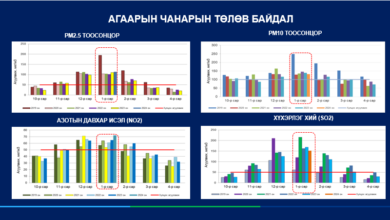 Энэ оны нэгдүгээр сарын байдлаар агаар бохирдуулах бодисын дундаж агууламжийг өмнөх оны мөн үетэй харьцуулахад PM10 тоосонцор 5, хүхэрлэг хий 10 хувиар буурсан, PM2.5 тоосонцор 4, азотын давхар исэл 11 хувиар тус тус өссөн байна. Азотын давхар исэл нь автомашины яндангаас гарч буй утаанд агууллагддаг аж.