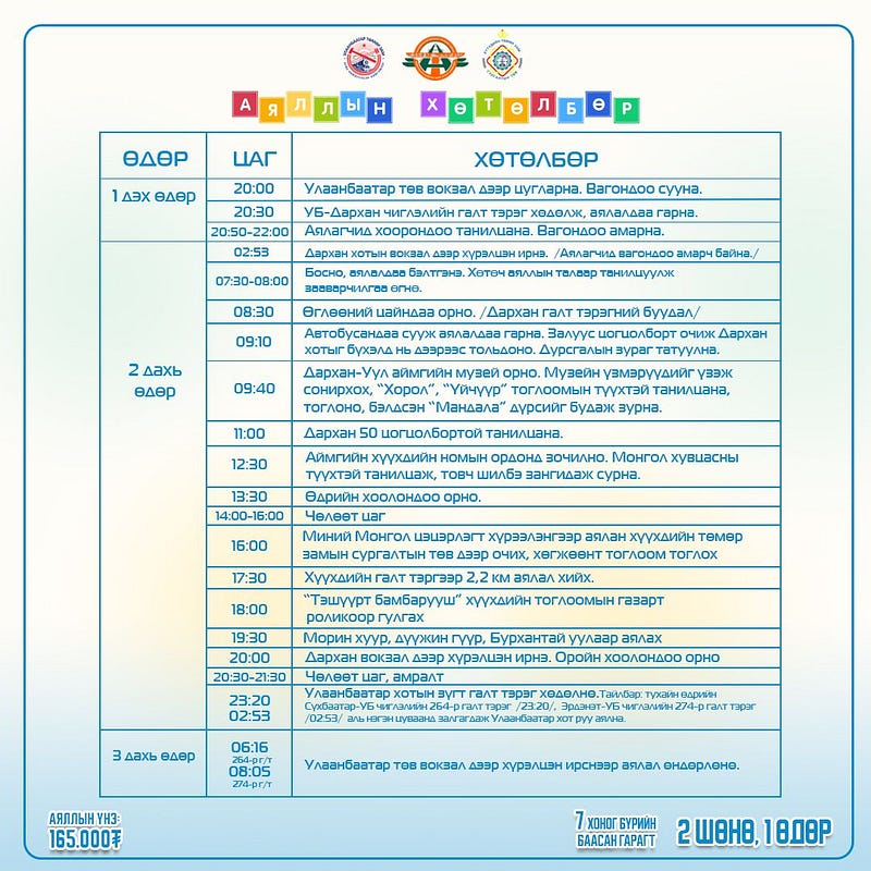 Улаанбаатар төмөр зам ХНН-ийн харьяа Аялал жуулчлалын төв долоо хоног бүрийн баасан гарагт “Хүүхдийн галт тэрэгний аялал”-ыг зохион байгуулж байна. 2024 оны гуравдугаар сарын 15, 22, 29-ний өдрүүдэд Улаанбаатар-ДарханУлаанбаатар чиглэлд аялна гэж "УБТЗ" ХНН-ээс мэдээллээ.