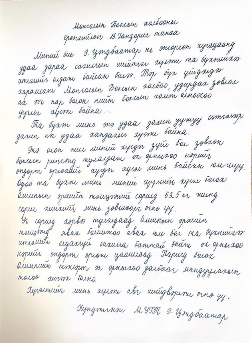 Уг сорилд тулалдаад олимпын эрхийн тэмцээнд юм бол та бүхнийхээ итгэлийг алдахгүй сахилга баттай байж эх орныхоо нэрийг өндөрт өргөж цаашлаад Парист болох олимпын тэнгэрт эх орныхоо далбааг мандуулахын төлөө хичээх болно. Хүсэлтийг минь хүлээн авч шийдвэрлэж өгнө үү" гэжээ.