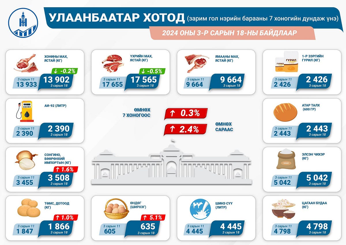 Улаанбаатар хотод 2024 оны 3 дугаар сарын 18-ны байдлаар гол нэрийн зарим хүнсний барааны үнэ өмнөх сараас 2.4 хувиар, өмнөх 7 хоногоос 0.3 хувиар тус тус өссөн байна.