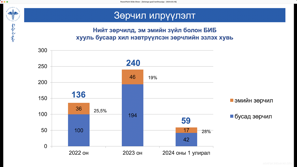 Эмийн үнийн өсөлтийн шалтгаан нөхцөлийг хянан шалгаж, “Эмийн үнийн өсөлтөд нөлөөлж буй гадаад дотоод хүчин зүйл”-ийн талаар Нээлттэй сонсгол зохион байгуулах үүрэг хүлээн ажиллаж буй Хянан шалгах түр хорооны гишүүд болон хянан шалгагч, шинжээч нар /2024.03.19-21 / Гаалийн ерөнхий газрын харьяа Сэлэнгэ аймаг дахь Гаалийн газарт ажиллав.