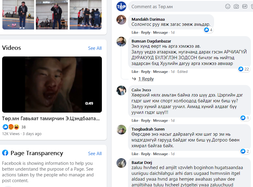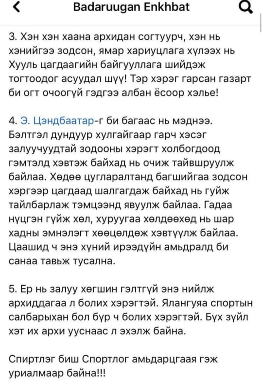 Удалгүй түүний бусдад зодуулж, ухаан алдсан бичлэг олон нийтэд ил болсон. Үүнтэй холбоотойгоор Монголын олимпын үндэсний холбооны Ерөнхий нарийн бичгийн дарга Э.Бадар-Ууганаас цахим хуудсаар өөрийгөө өмөөрөх, хаацайлах зүйлс бичсээр байгаад олон нийт дургүйцэж байна.