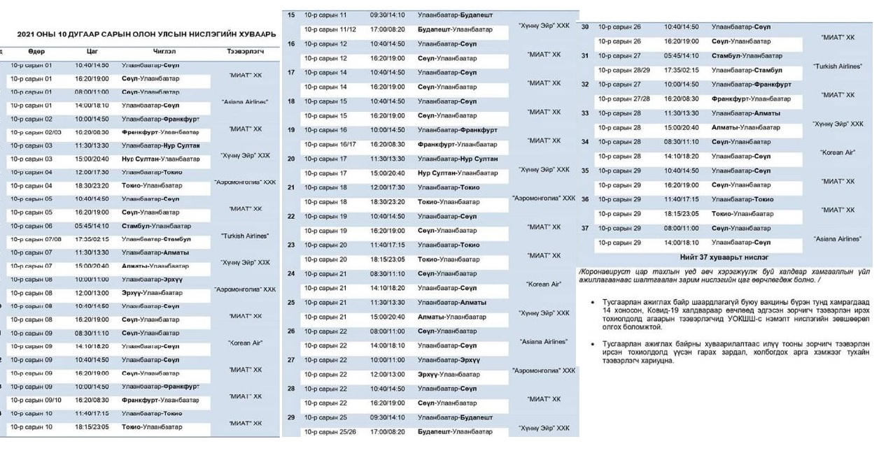Иргэний нисэхийн ерөнхий газраас ирэх 10 дугаар сард хийгдэх олон улсын нислэгийн хуваарийг баталсан байна. Энэ удаа нийт 38 удаагийн нислэг үүлдэгдэхээр болжээ.