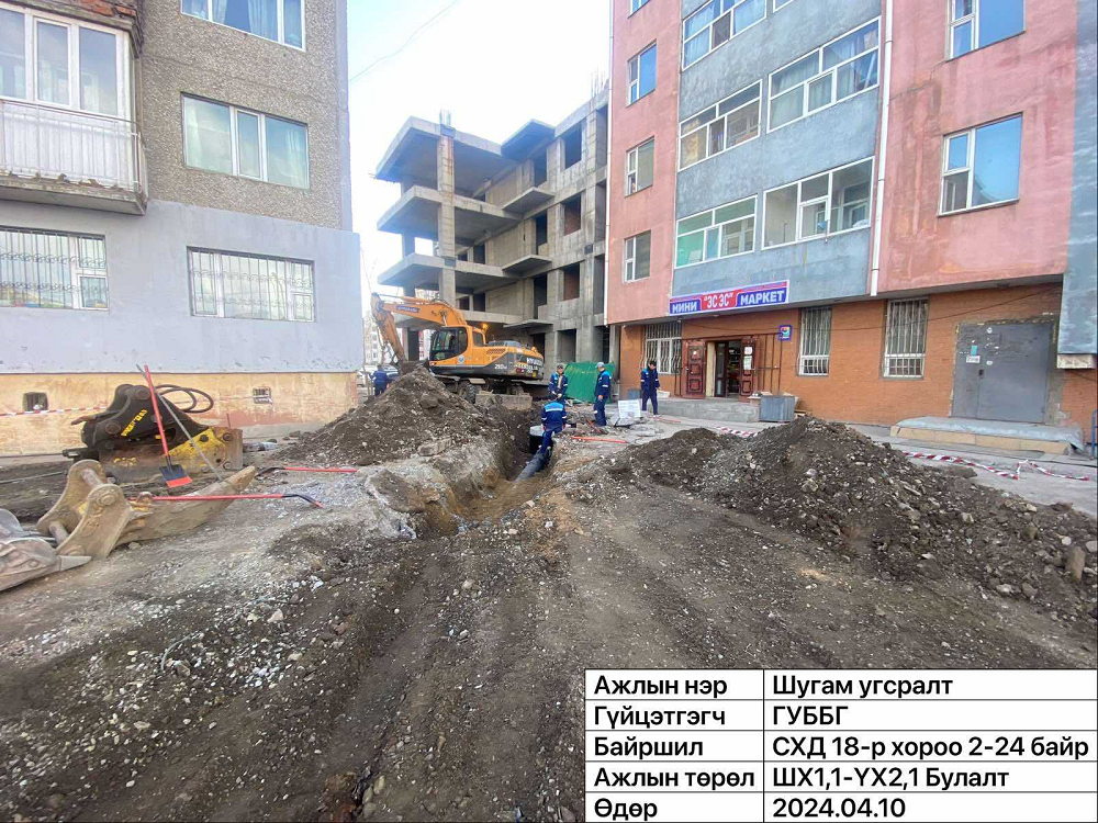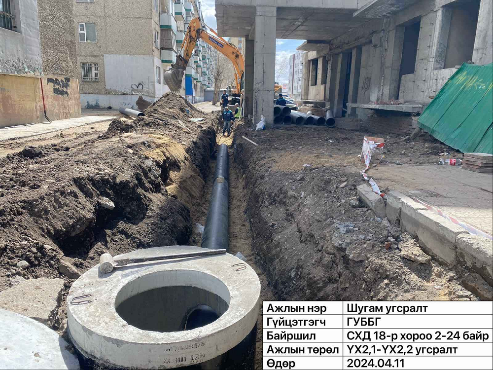 Сонгинохайрхан дүүргийн 18 дугаар хорооны 2-24 байр орчимд борооны ус зайлуулах шугам угсарч байна.