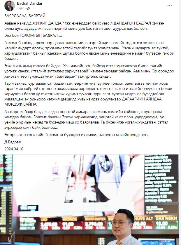 Тэгвэл яг л түүний араас явж байгаа нэг нь Голомтын Д.Бадрал. Эртнээс улс төрд орох гээд бэлдэж байсан тэрбээр улс төрийн дамжааны “ШАРК” нэвтрүүлэгт ороод одоо улс төрд орохоор ГОЛОМТ банкнаас голомтоо салгаж байна.