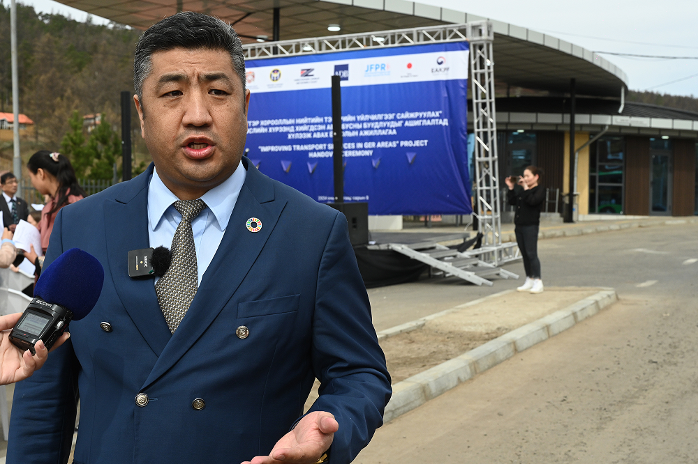 “Гэр хорооллын нийтийн тээврийн үйлчилгээг сайжруулах” төслийн зохицуулагч О.Мөнхнасан: Төслийн хүрээнд бид нийтийн тээврийн үйлчилгээ эрхэлдэг байгууллагуудын ажилтан, албан хаагч, жолооч нарыг чадавхжуулах, нийтийн тээврийн үйлчилгээ, аюулгүй байдлыг сайжруулах тал дээр үе шаттай ажил арга хэмжээг хэрэгжүүлж байгаа. Үүнээс гадна автобусны буудлыг шинээр ашиглалтад оруулах нь төслийн нэгдүгээр зорилт байсан. Өнөөдөр бид 19 шинэ автобусны буудлыг ашиглалтад оруулж хүлээлгэн өгч байгаа. Ингэхдээ автобусны эцсийн зогсоолд шинээр 0,8 км асфальтбетон замыг барьж ашиглалтад орууллаа.