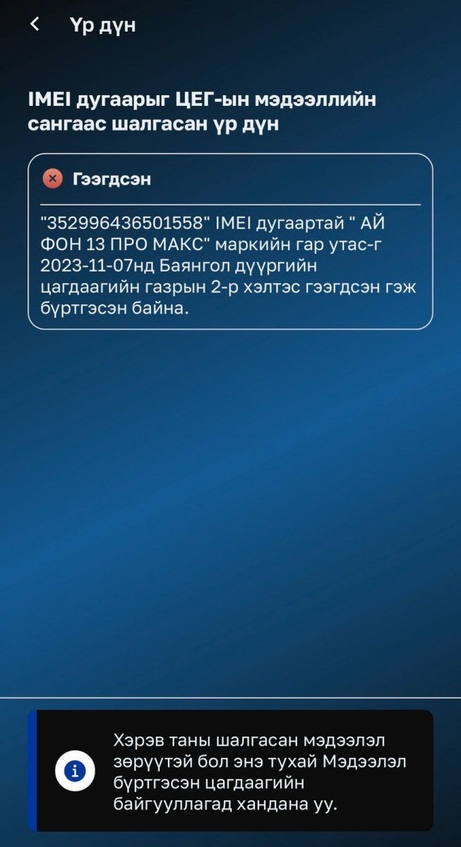 Уг ажлын хүрээнд алдагдсан болон гээгдүүлсэн гар утасны IMEI дугаараар хайлт хийж, мэдээлэл авах боломжийг “Төрийн цахим үйлчилгээний E-Mongolia” системд нэвтрүүллээ. Тухайлбал, Цагдаагийн байгууллагад эрэн сурвалжлагдаж байгаа болон гээгдүүлсэн гар утасны мэдээллийг “Төрийн мэдээлэл солилцооны ХУР” системээр дамжуулан тухайн иргэн өөрөө IMEI дугаараар шалгах үйлчилгээг энэ оны зургадугаар сарын 5-ны өдрөөс эхлэн үйл ажиллагаанд нэвтрүүлээд байна. Ингэснээр хулгайлагдсан гар утсыг бусдад зарж, борлуулдаг хууль бус үйлдлийг таслан зогсоох, тухайн гар утасыг худалдан авч байгаа иргэд хулгайлагдсан гар утас мөн эсэхийг өөрөө шалгадаг нөхцөл, боломжууд бүрдэж байгаа юм.