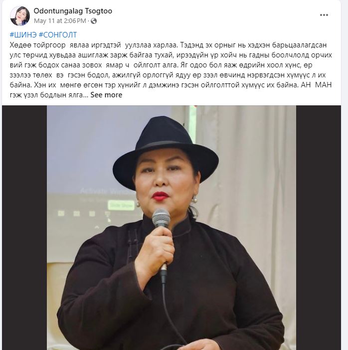Гэтэл Иргэдийнхээ нэрийн өмнөөс тойрог төлөөлж байгаа төлөөлөгчид иргэдийн эрх ашгийг урьтал болгохоос илүү урамшууллаа авах гэж үүд хаалга сахиж суудаг байх гэж. Ийм түүхийг бичиж үлдээсэн Ц.Одонтунгалаг зааны гэргий гэх дүрээр өөрийгээ рекламдаж УИХ-ын сонгуульд нэр дэвшиж яваа.