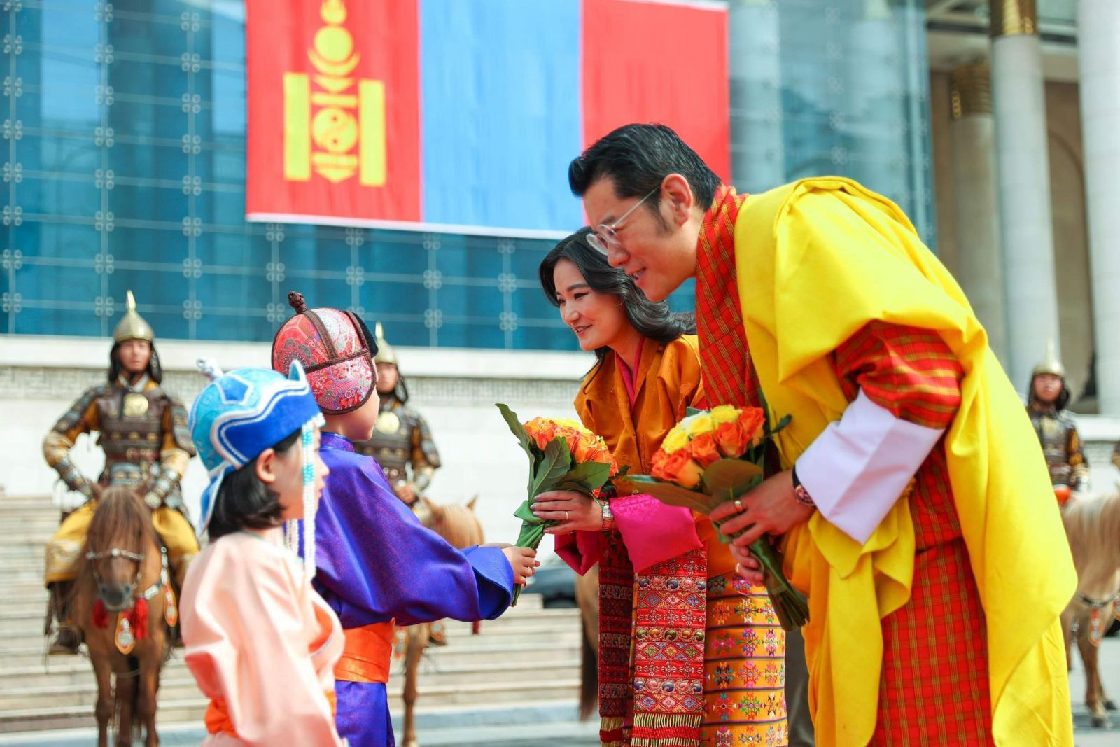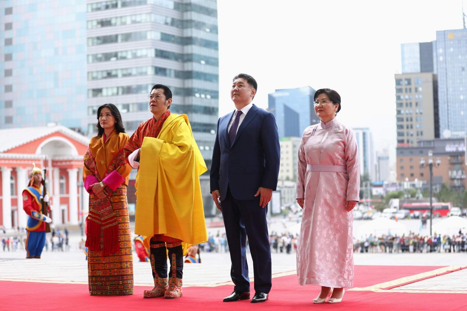 Монгол Улсын Ерөнхийлөгч Ухнаагийн Хүрэлсүх, гэргий Лувсандоржийн Болорцэцэгийн хамт Бутаны Хаант Улсын Цог Жавхлант Хаан Жигмэ Гэсэр Намжил Ванчук, Хатан Жэцүн Пэма Ванчук нарыг Д.Сүхбаатарын талбайд албан ёсоор угтан авлаа.
