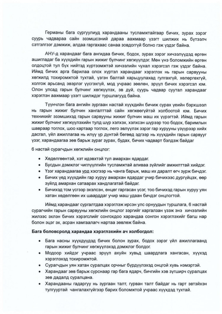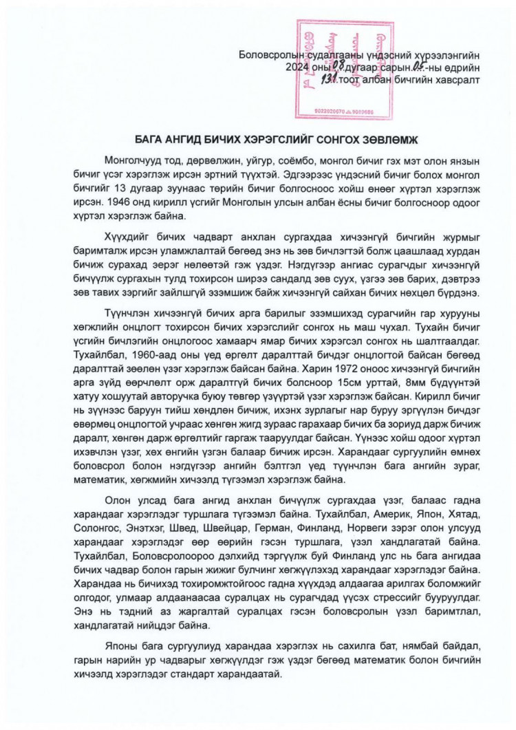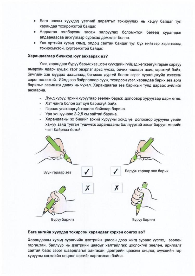 "Хүүхэд алдаанаасаа айх бус засаж залруулан суралцах боломжийг бий болгох үүднээс энэ хичээлийн жилээс эхлэн бага ангийн сурагчдын бичгийн хэрэгсэлд харандаа ашиглахыг багш, эцэг эх, асран хамгаалагч нарт зөвлөж байна.