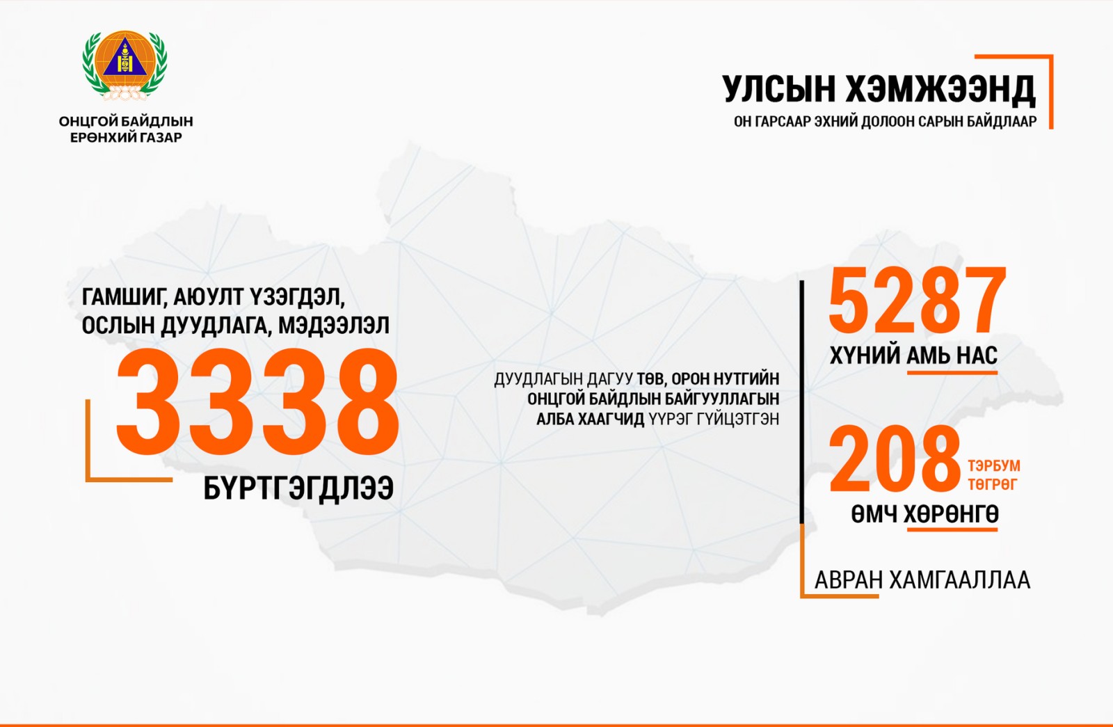 Дуудлагын дагуу төв, орон нутгийн Онцгой байдлын байгууллагын алба хаагчид үүрэг гүйцэтгэн, 5287 хүний амь нас, 208 тэрбум төгрөгийн өмч хөрөнгийг авран хамгааллаа.