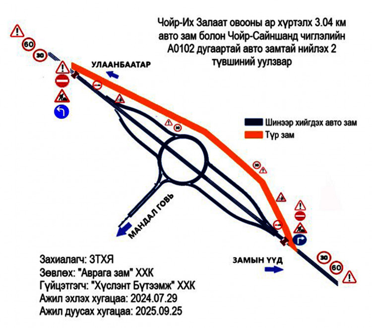 Энэхүү ажил нь А0102 Улаанбаатар-Замын Үүд чиглэлийн улсын чанартай авто замын Улаанбаатар талаас 231.1-232.2 дахь километрт 1.1 км давхцаж байгаа бөгөөд төслийн зам барилгын ажлаас хамаарч тус хэсэгт түр замаар зорчуулахаар боллоо.