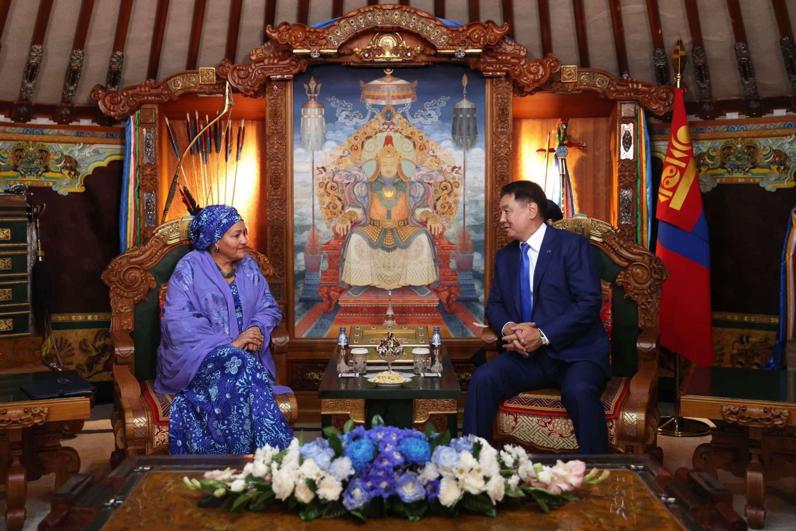 Монгол Улсын Ерөнхийлөгч Ухнаагийн Хүрэлсүх Дэлхийн эмэгтэйчүүдийн чуулга уулзалтад оролцож буй НҮБ-ын Ерөнхий нарийн бичгийн даргын орлогч Амина Мохаммедыг хүлээн авч уулзлаа.