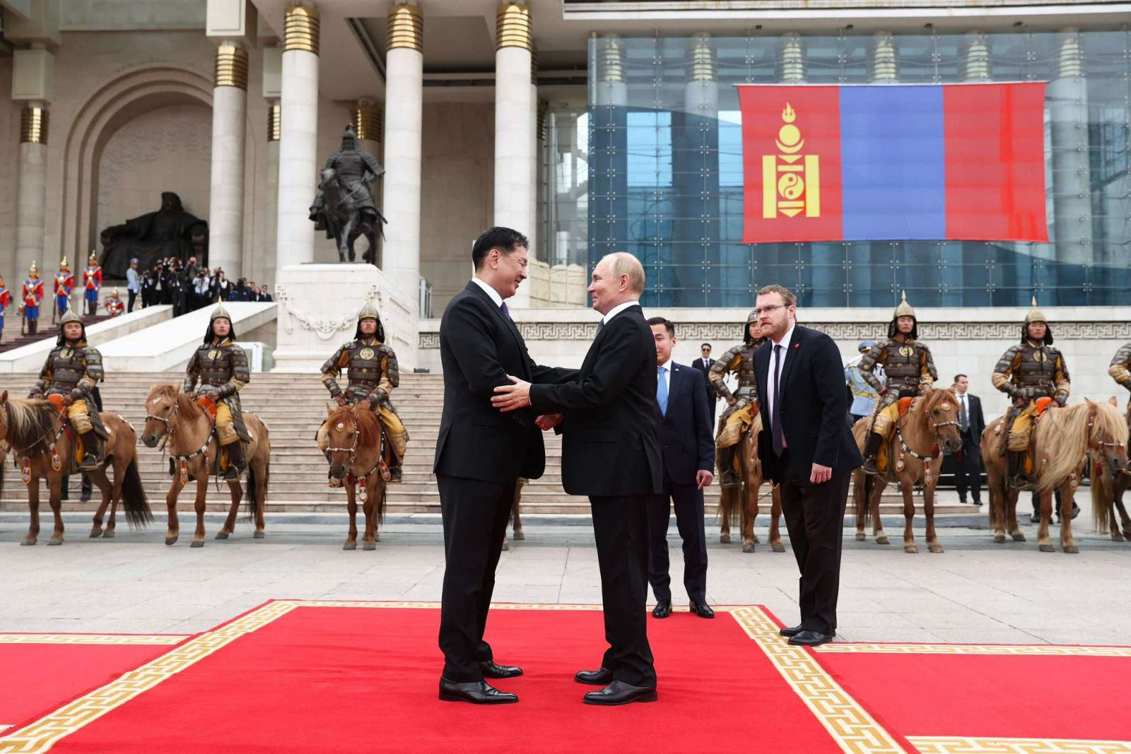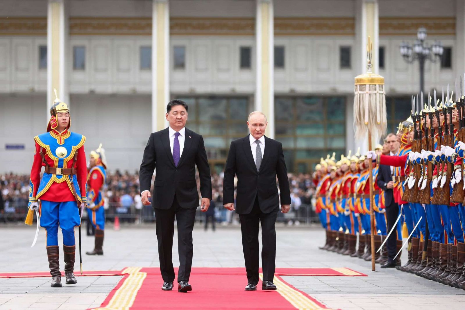 Монгол Улсын Ерөнхийлөгч Ухнаагийн Хүрэлсүх ОХУ-ын Ерөнхийлөгч В.В.Путиныг Д.Сүхбаатарын талбайд албан ёсоор угтаж авлаа. Төрийн хүндэт харуулын захирагч айлтгал өргөсний дараа хөгжимд хоёр улсын Төрийн дуулал эгшиглэв.