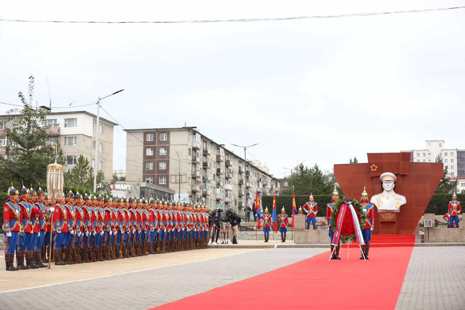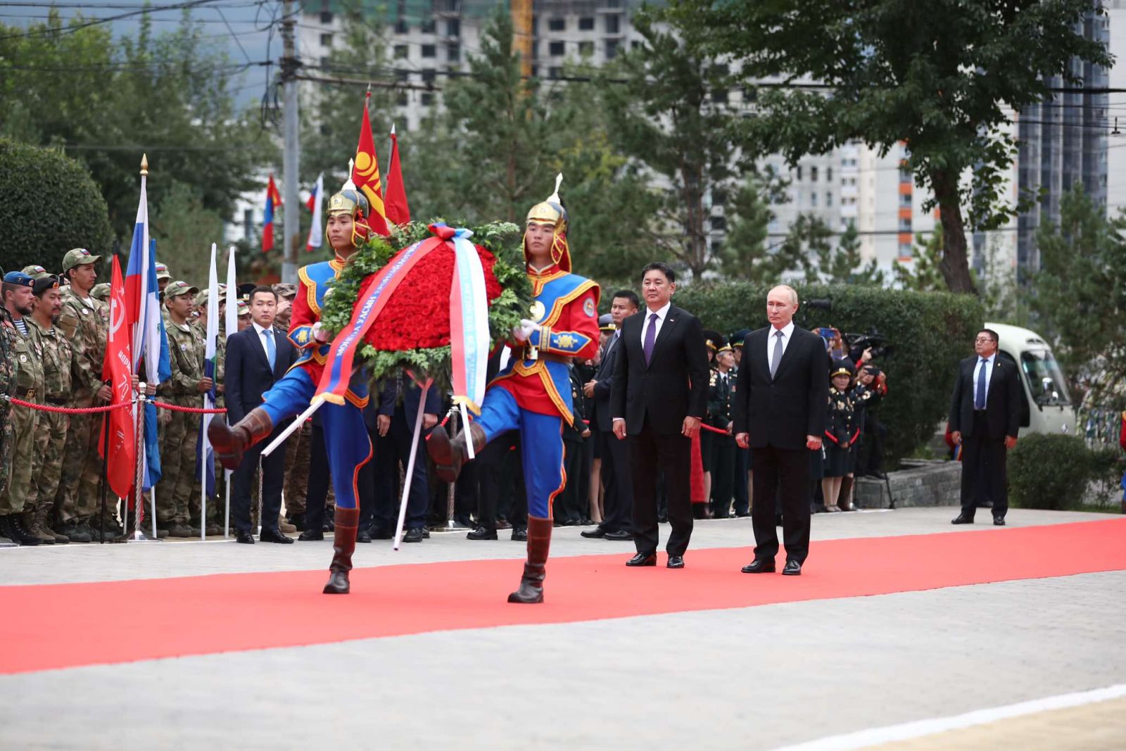 Монгол Улсын Ерөнхийлөгч Ухнаагийн Хүрэлсүх, Халх голын байлдааны ялалтын 85 жилийн ойг тэмдэглэх хүрээнд албан ёсны айлчлал хийж буй ОХУ-ын Ерөнхийлөгч В.В.Путин нар БНМАУ-ын баатар, ЗХУ-ын дөрвөн удаагийн баатар маршал Г.К. Жуковын хөшөөнд хүндэтгэл үзүүлж, цэцэг өргөв.
