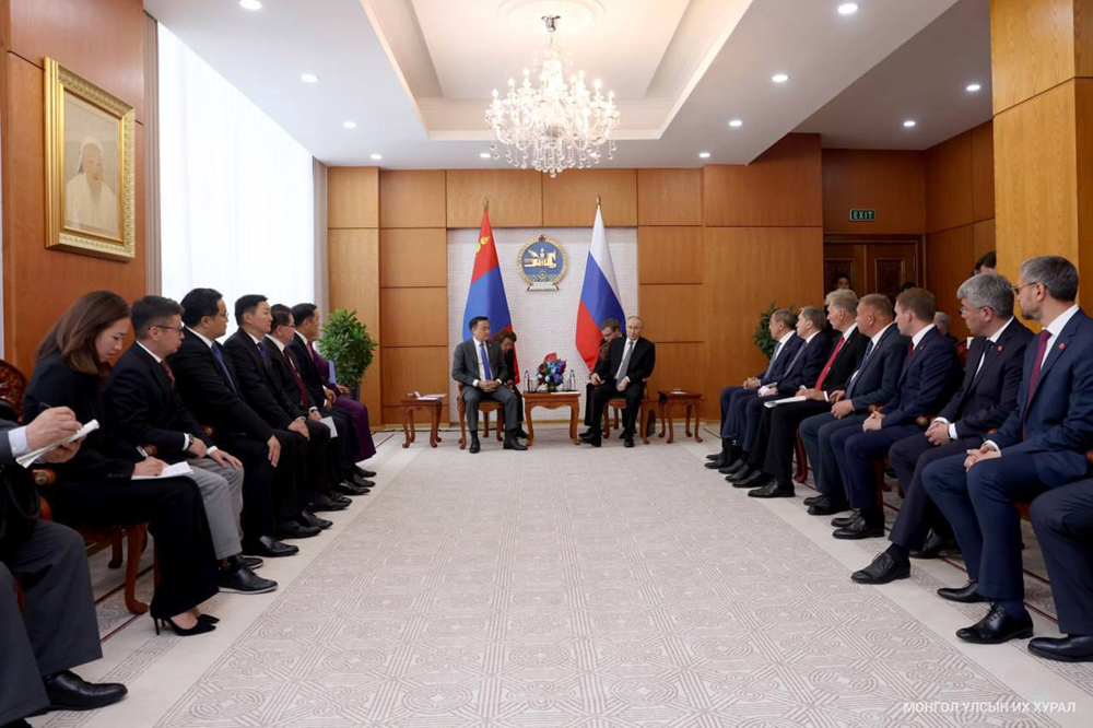 Уулзалтын эхэнд, Монгол Улсын Их Хурлын дарга Д.Амарбаясгалан Оросын Холбооны Улсын Ерөнхийлөгч В.В.Путинг Монгол Улсын Ерөнхийлөгч У.Хүрэлсүхийн урилгаар Халхын голын байлдааны түүхт 85 жилийн ойг тэмдэглэх хүрээнд Монгол Улсад айлчлал хийж байгаад баяртай байгаагаа илэрхийлэв.