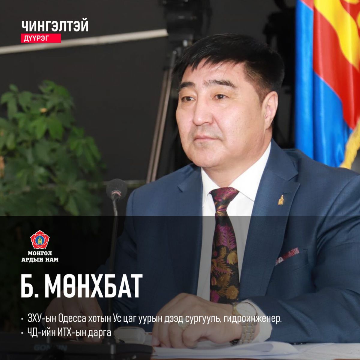 Чингэлтэй дүүргийн ИТХ-ын дарга, нэр дэвшигч Б.Мөнхбат ЗХУ-ын Одесса хотын Ус цаг уурын дээд сургуульд гидроинженер мэргэжлээр суралцан төгсжээ.