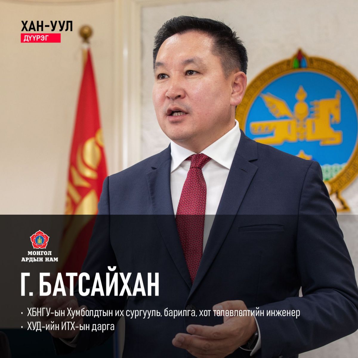 Хан-Уул дүүргийн ИТХ-ын дарга, нэр дэвшигч Г.Батсайханы тухайд ХБНГУ-ын Хумбольдтын Их сургуулийг хот төлөвлөлт, барилгын инженерээр төгссөн байна.