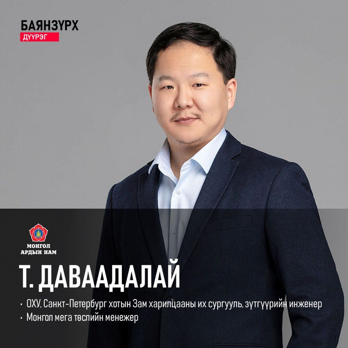 Баянзүрх дүүрэгт Т.Даваадалайг сойж байна. “Тавантолгойн нүүрс ачих логистикийн төв”-ийн төслийн захирлаар ажилладаг. ОХУ-ын Санкт Петербург хотын Зам харилцааны их сургуулийг төгсөж, зүтгүүрийн инженер мэргэжил эзэмшжээ.
