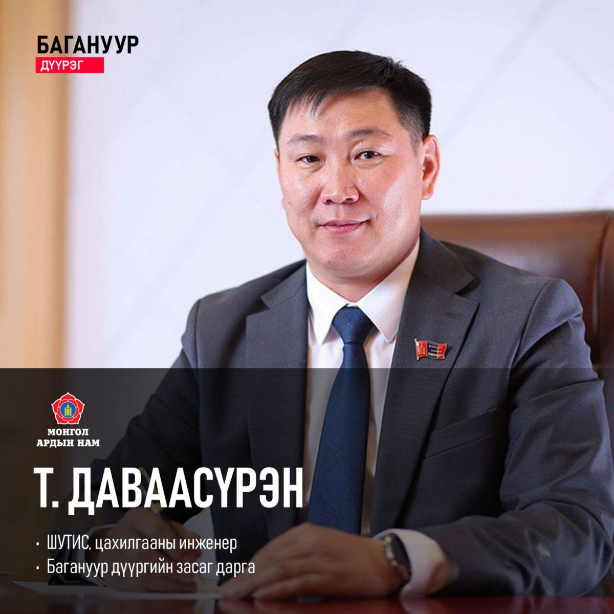 Багануур дүүргийн Засаг дарга, нэр дэвшигч С.Даваасүрэн ШУТИС-ийг цахилгааны инженер мэргэжлээр дүүргэжээ. Ажлын гараагаа “Багануур Зүүн өмнөд бүсийн цахилгаан түгээх сүлжээ” ТӨХК-аас эхэлж байжээ.