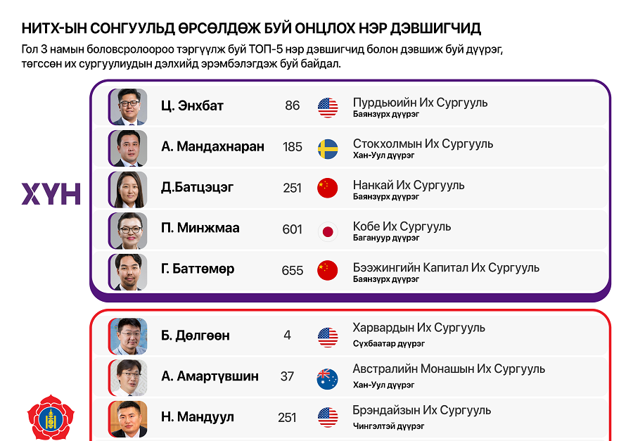 ● Ц.Энхбат - Баянзүрх дүүрэгт өрсөлдөж байгаа тэрбээр дэлхийн ТОП100 их сургуулийн нэг болох Америкийн Пурдьюийн их сургууль нэмээд 2 ч оронд боловсрол эзэмшсэн буюу 3 орны боловсролтой нэгэн. Уг үзүүлэлтээрээ НИТХ-ын сонгуульд өрсөлдөж буй нэр дэвшигчдийн боловсролын чансааг өнгөлж буй.