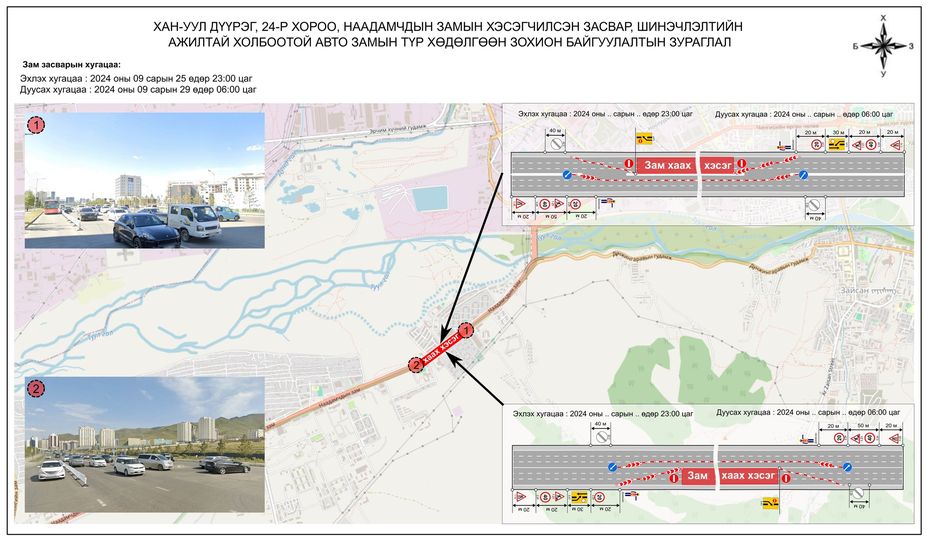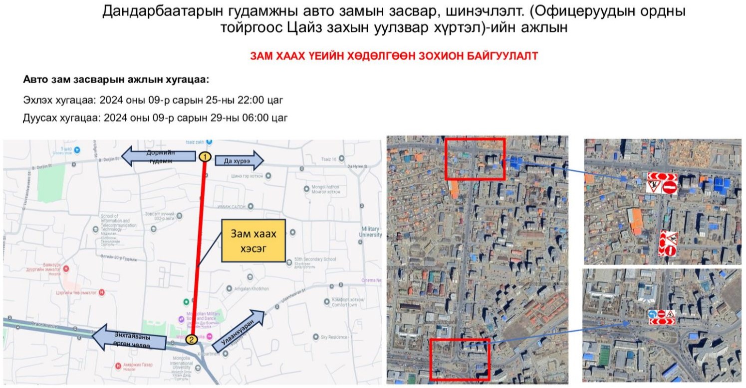 - Авто замын хөдөлгөөнийг есдүгээр сарын 25-ны 23:00 цагт хааж, 29-ний 06:00 цагт нээнэ.