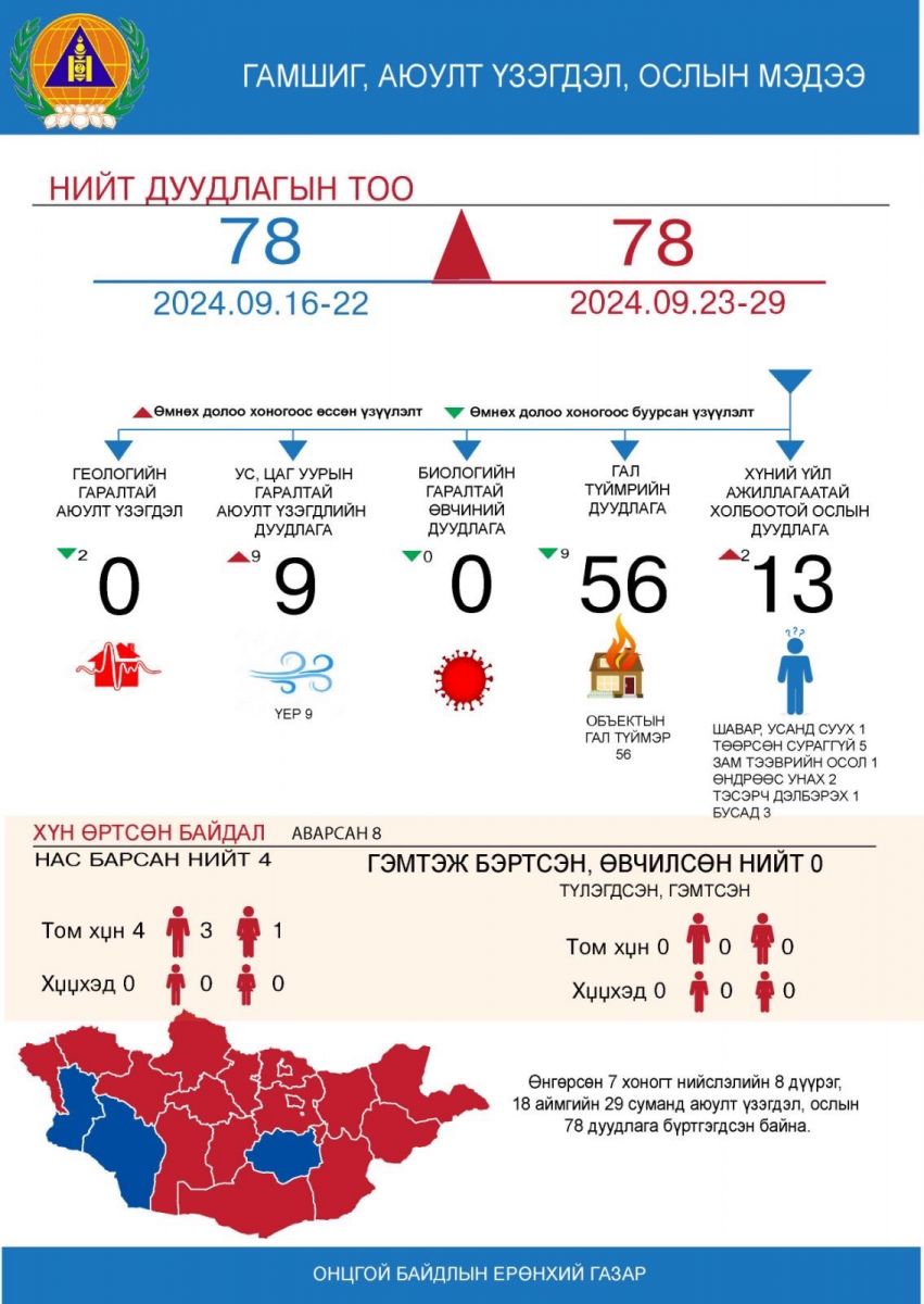 Улсын хэмжээнд өнгөрсөн долоо хоногт /2024.09.23-29/ нийслэлийн 8 дүүрэг, 18 аймгийн 29 суманд аюулт үзэгдэл, ослын 78 удаагийн дуудлага бүртгэгдлээ.