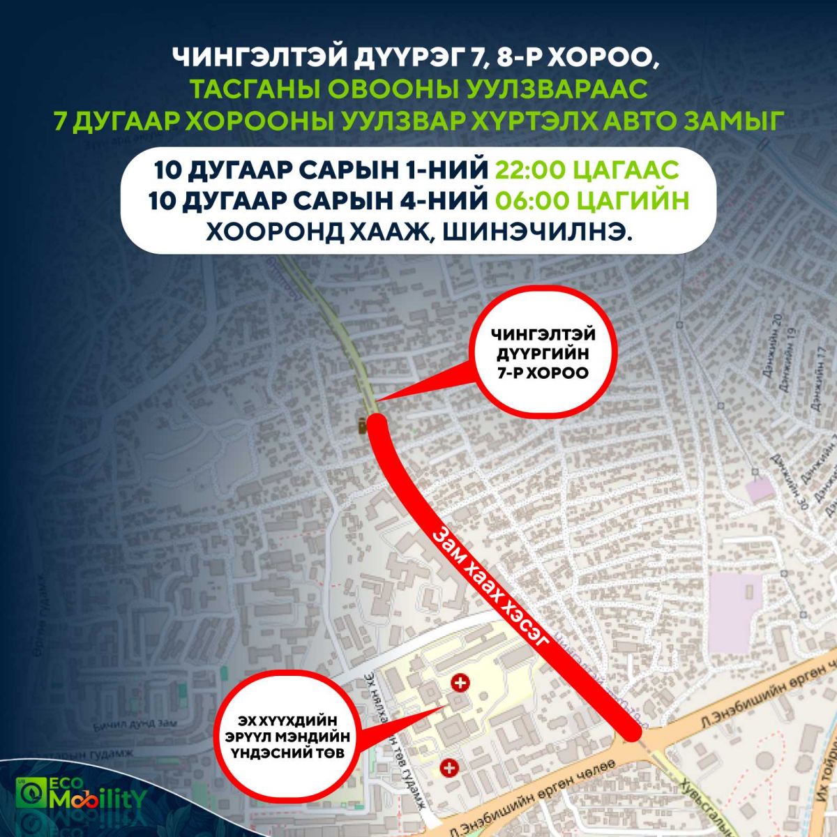 Чингэлтэй дүүргийн 7, 8 дугаар хороо, Тасганы овооны уулзвараас 7 дугаар хорооны уулзвар хүртэлх авто замыг аравдугаар сарын 1-ний 22:00 цагаас хаасан бөгөөд аравдугаар сарын 4-ний өдрийн 06:00 цагт нээх юм.