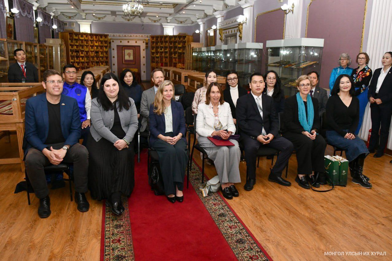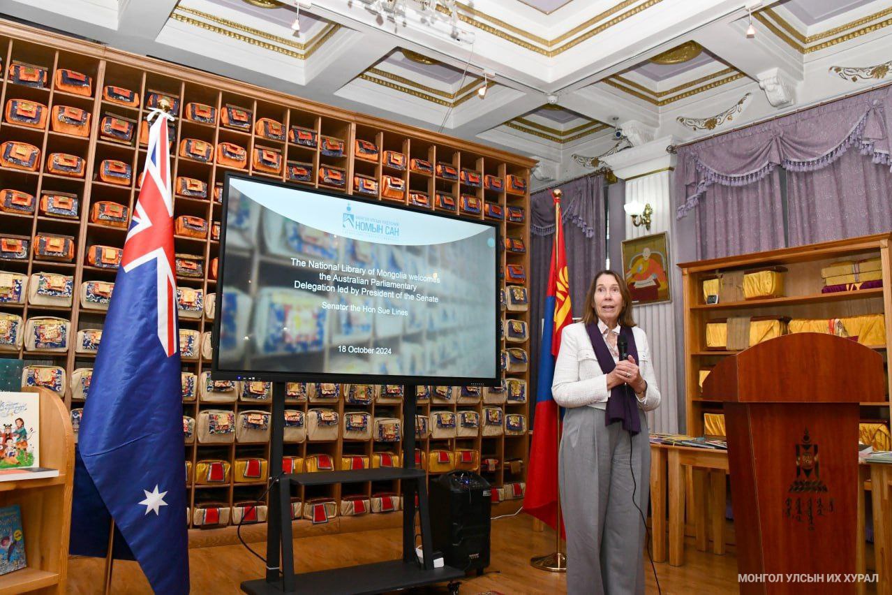 Монгол Улсын Их Хурлын дарга Дашзэгвийн Амарбаясгалангийн урилгаар Австралийн Холбооны Улсын Парламентын Сенатын танхимын Ерөнхийлөгч Сюзан Лаянс тэргүүтэй Сенатын гишүүд 2024 оны 10 дугаар сарын 16-19-нд Монгол Улсад албан ёсоор айлчилж байна. Зочид төлөөлөгчид өнөөдөр /2024.10.18/ Монгол Улсын Үндэсний номын сангийн Үнэт ховор номын музейд зочилж, Монголын оюуны өв, хосгүй ховор бүтээлүүдтэй танилцлаа.