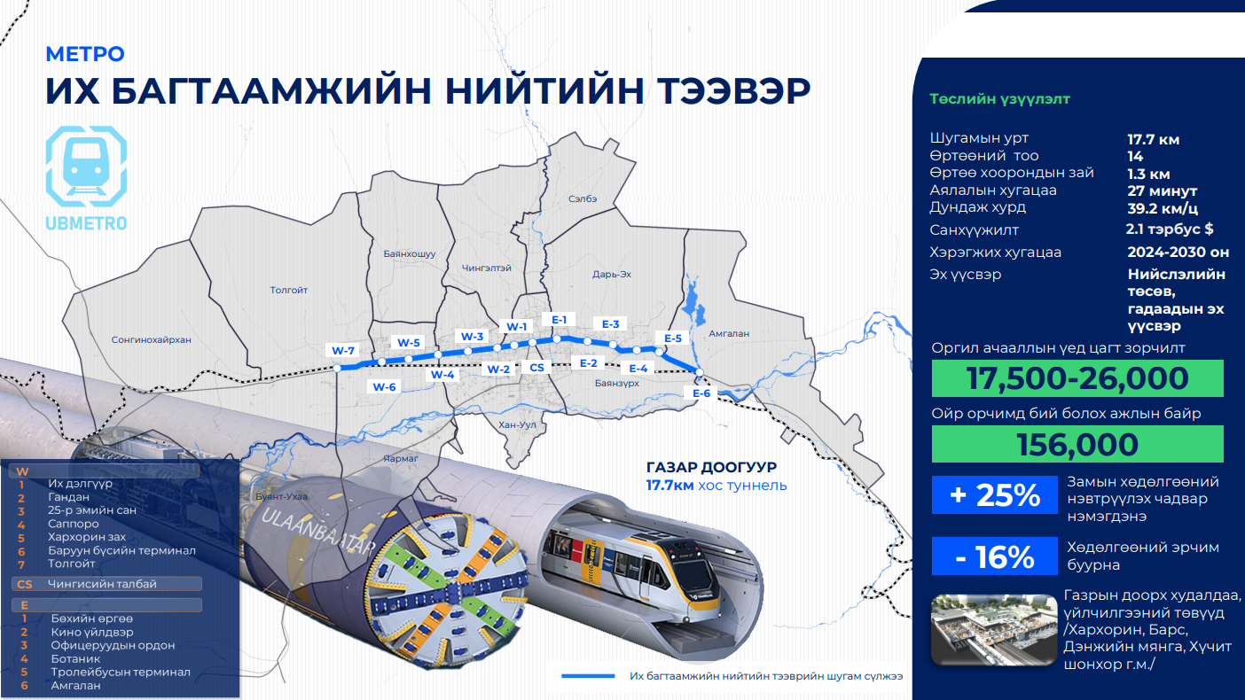 2024-2028 онд нийслэлийн нийтийн тээвэрт их багтаамжийн олон төрөлт тээврийн хэрэгсэл нэвтрүүлж байгаагийн нэг нь метро. Метроны чиглэл Амгалангаас Толгойт хүртэл нийт 17 км үргэлжилнэ.