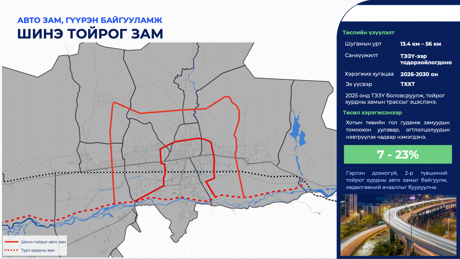 Тодруулбал, 2024-2028 онд нийслэлд түгжрэлийг бууруулах хүрээнд хоёр түвшний замуудыг барих ажлыг үе шаттай хийнэ. Хот доторх хөдөлгөөний ачааллыг бууруулах гэрлэн дохиогүй, хоёр түвшний тойрог хурдны авто зам байгуулах зөвлөх үйлчилгээний тендерийг арваннэгдүгээр сарын 25-нд хаах бөгөөд ТЭЗҮ-г 2025 онд бүрэн боловсруулах юм.