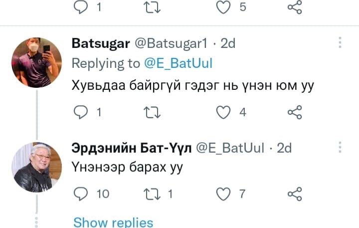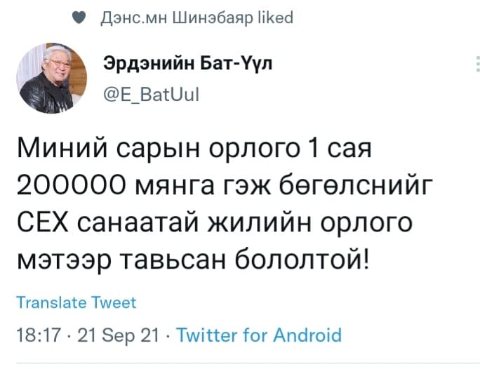 Сонгинохайрхан дүүргийн нөхөн сонгуулийн 28-р тойрогт Ардчилсан намаас нэр дэвшигч Э.Бат-Үүлийн сенсаци үргэлжилсээр. Тодруулбал, тэрээр “Миний сарын орлого 1.200.000 төгрөг гэж бөглөснийг СЕХ санаатай жилийн орлого мэтээр тавьсан бололтой” гэх үгсийг жиргээнд чулууджээ. Ардчилсан намын өвөг эцэг гэж нэрлэгдэх тэрээр өөрийн сарын орлогыг 1.200.000 төгрөг гэж мэдээллэсэн нь иргэдийн эгдүүцлийг улам л хүргээд авсан. Ардчиллыг мөлжиж хөрөнгөжсөн гэх тодотголтой лидер эрхэм маань сард сая гаран төгрөгийг орлоготойгоос гадна “Хувьдаа байргүй гэдэг үнэн юм уу? гэх асуултад, ҮНЭНЭЭР барах уу гэж хариулжээ.